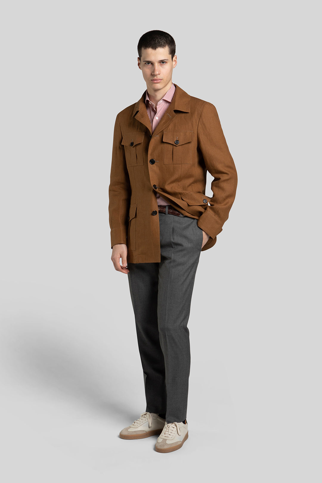A perfect blend of a shirt jacket and a field jacket, the safari jacket was designed for warmer climates. Its multiple pockets provide ample space for essentials like your phone, sunglasses, cigars, or anything else that ensures a successful vacation. Opt for one in linen, lightweight cotton, or tropical wool for a look that is both practical and effortlessly elegant.