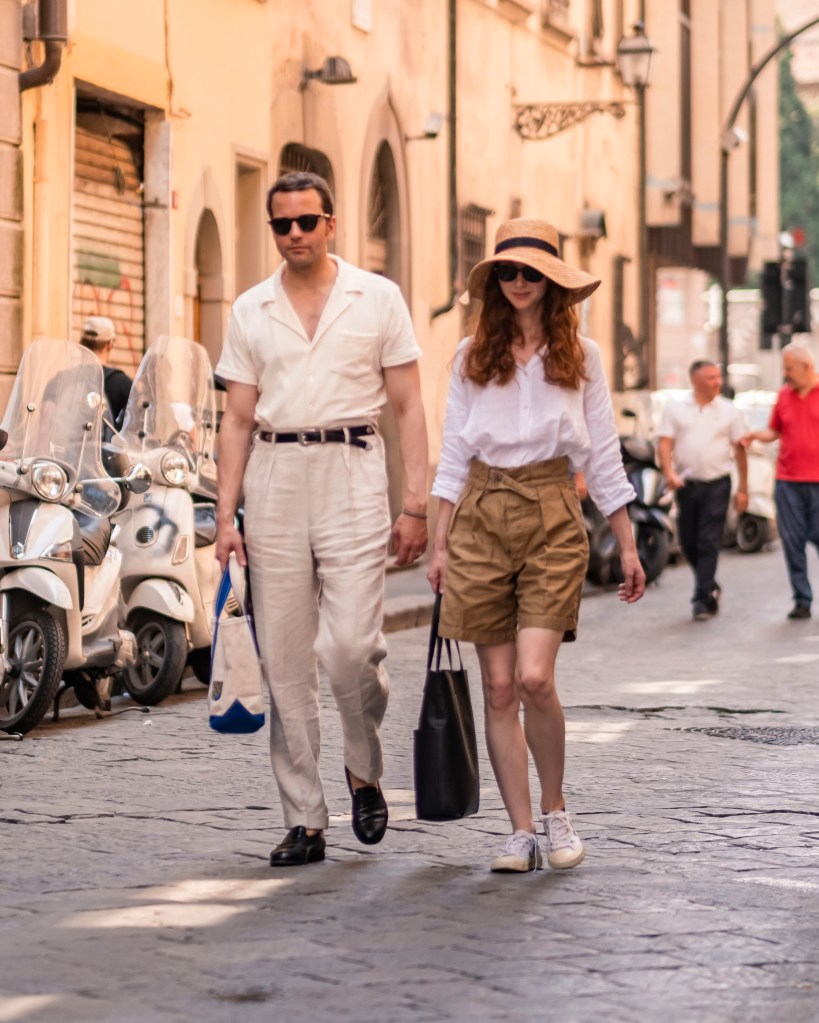 Linen is always a smart choice, whether for shorts on a beach promenade or trousers for a sunset dinner. Light tones help keep you cool and pair beautifully with a sun-kissed complexion.