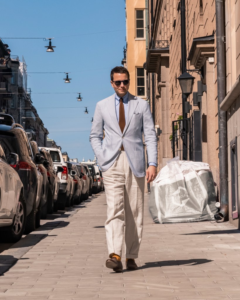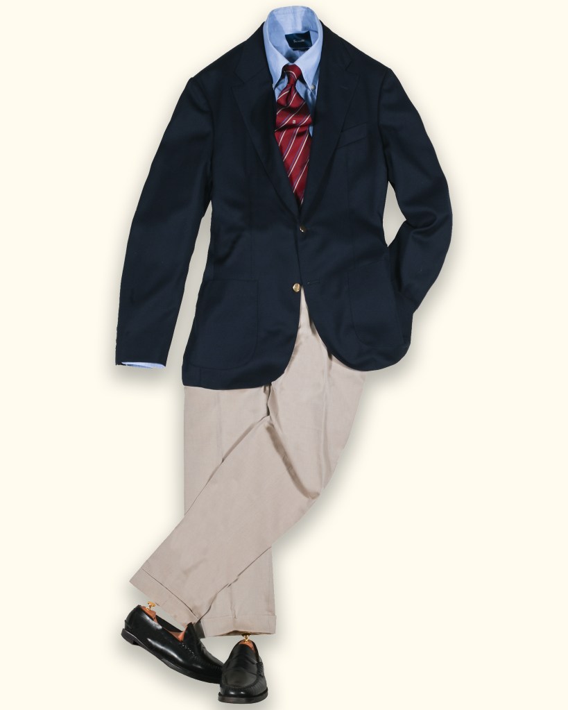 Ivy style sport coats, sack jackets, share many traits with various Italian jackets, but also differ in important ways. These jackets were more influenced by sports and an active, youthful lifestyle than by the Old World. The shoulders are natural, meaning they follow the wearer’s shoulder line—, and the jackets lack front darts (similar to Florentine tailoring), yet are cut quite wide, hence the name sack jackets. They typically feature three front buttons, where the top button is concealed by the lapel, giving rise to the term 3-roll-2 (also found in Neapolitan tailoring).